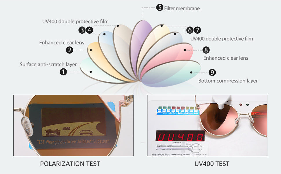2.100% UV400 protection lenses,blocks 100% harmful UVA & UVB Rays,protect your eyes against UV damage and make them comfortable,also offering the high definition vision for you.