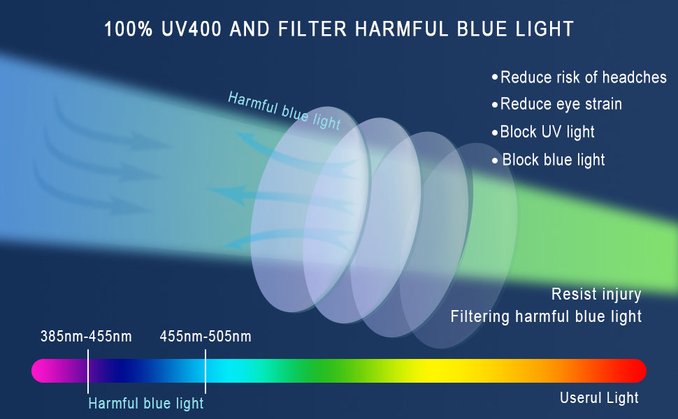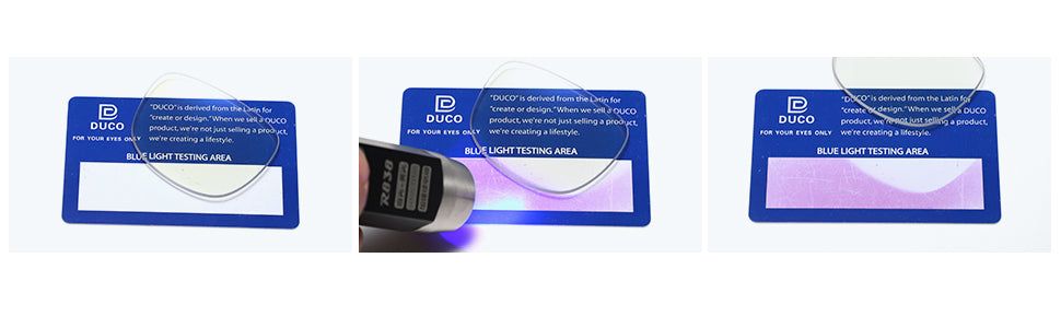 Prolonged exposure to high-energy visible (HEV) blue light can lead to eye strain and blurred vision. DUCO blue blocker lenses reflect and filter the blue light emitted in artificial light.
