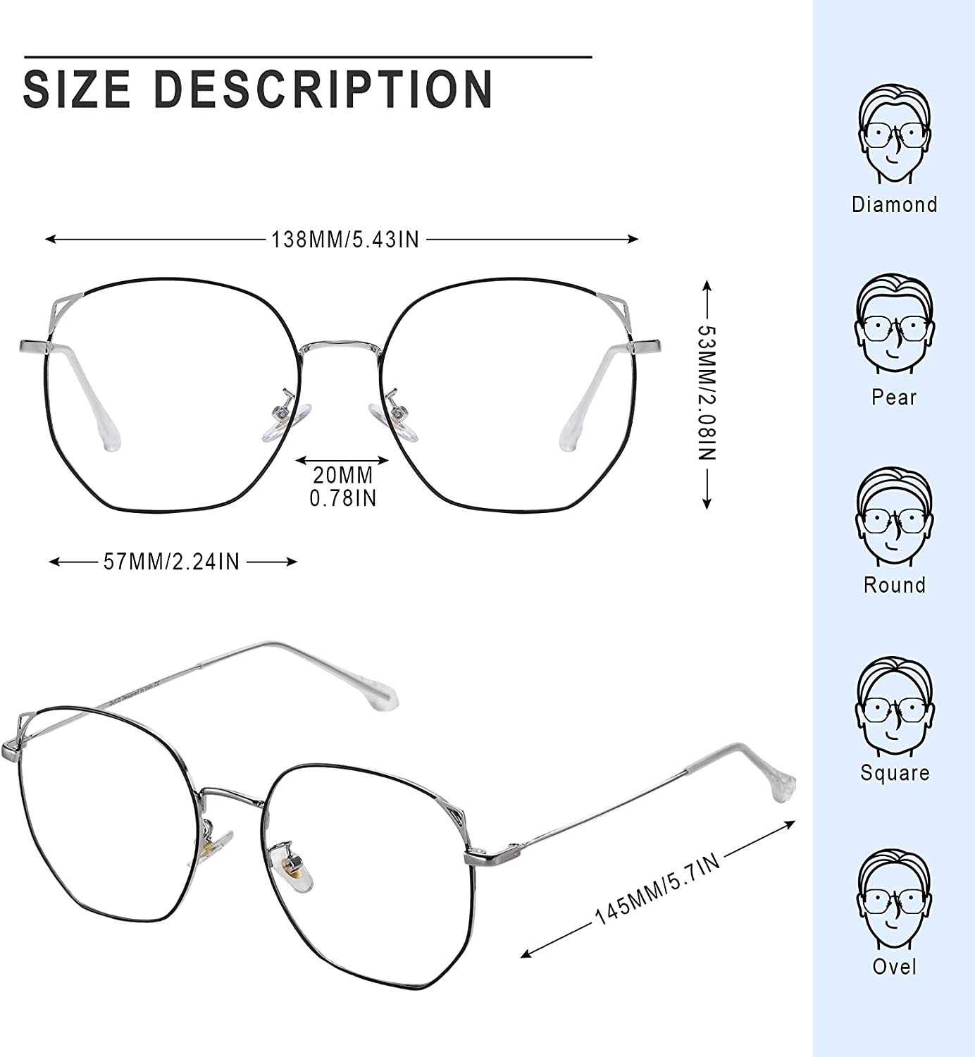- 🤗【Product size】Lens height: 53mm (2.08inches) | Lens width: 57mm (2.24inches)| Frame: 138mm (5.43inches) | Nose bridge: 20mm ( 0.78inches) | Temple length: 145mm (5.7inches)