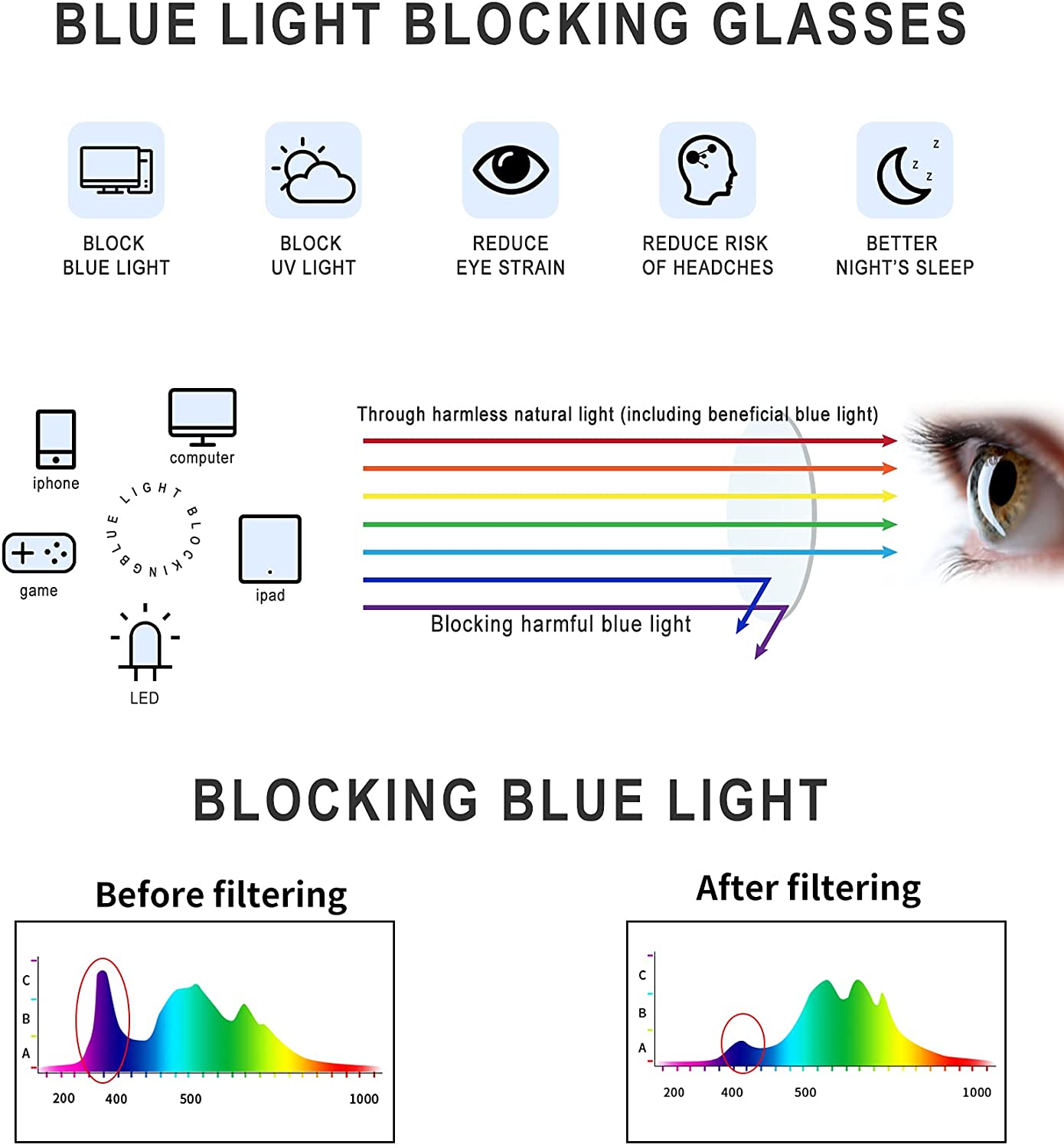 Long time exposure to blue light would lead to digital eye fatigue. Wearing your blue light glasses, no more tired eyes. Reduce eye strain and sensitivity to light when facing digital screens. Great for office workers or anyone who has to look at screen all day.