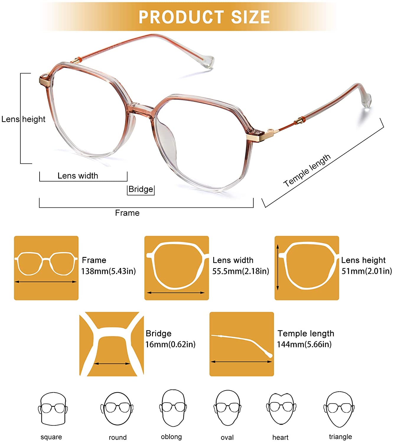 - 🤩[SUPERIOR LIGHT FILTERING] Our glasses offer superior protection from blue light through the use of multiple coatings of blue light filter layers, both inside and out. Product Size: frame width 138mm(5.43in) lens width 55.5mm(2.18in) lens height:51mm(2.01in) bridge:16mm(0.62in) temple length:144(5.66in)